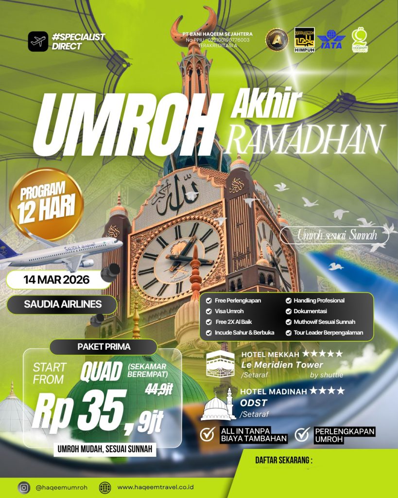 Bulan Ramadhan adalah bulan pendidikan, melalui rumah dan masjid dapat kita jadikan media untuk untuk mendidik anak- anak kita, dilingkungan rumah kita ajarkan anak-anak kita untuk puasa, membaca Al-Quran, dan dengan masjid kita dapat jadikan sebagai media untuk melatih anak-anak kita shalat tarawih, Berikut ini Paket Umroh Akhir Ramadhan bersama Haqeem Travel yang merupakan travel umroh terpercaya dengan izin PPIU 02210019007760003